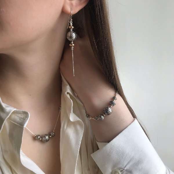 Браслет с содержанием серебра 925 пробы, вставка, гематит. Ширина большого шарика 12 мм, среднего 9 мм, маленького 6 мм, гематит диаметр 3, 6 мм.Толщина цепи 1мм. Средний вес изделия 12,8 гр. Производство Израиль.