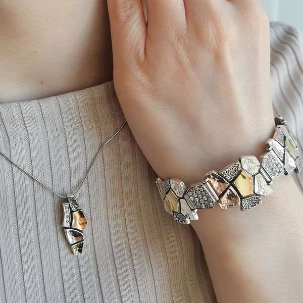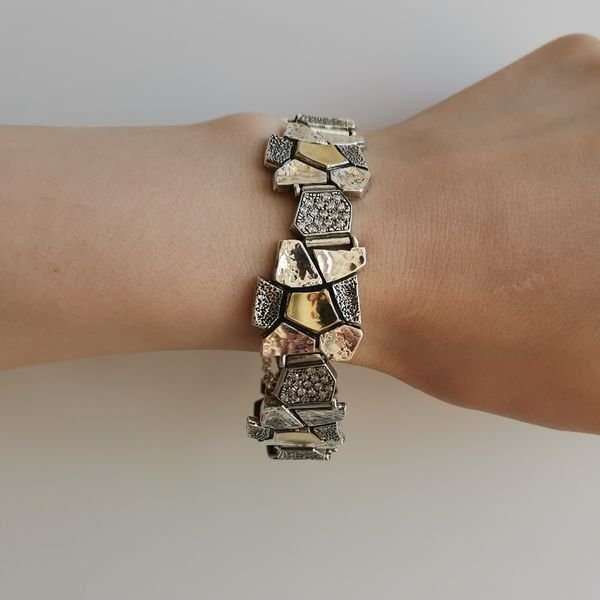 Браслет из серебра 925 пробы, вставка куб.циркон, пластина из золота. Диаметр вставок куб.циркон 1 мм. Размер художественного элемента 20х20 мм, меньшего 12х10 мм. Средний вес изделия 35,3 гр. Производство Израиль.
