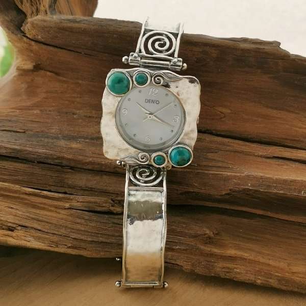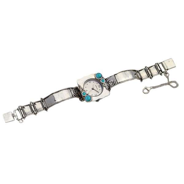 Часы из серебра 925 пробы, вставка бирюза. Диаметр вставок 6 и 4 мм. Размер корпуса часов 26 мм х 27 мм. Часы оснащены японским кварцевым механизмом с гарантией 1 год. Ширина браслета 12 мм. Размер браслета можно уменьшить за счет удаления звеньев. Циферблат диаметром 19 мм покрыт натуральным перламутром. Сапфировое стекло. Средний вес изделия 42,15 гр. Производство Израиль.