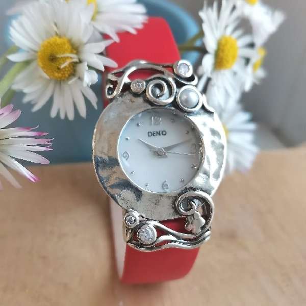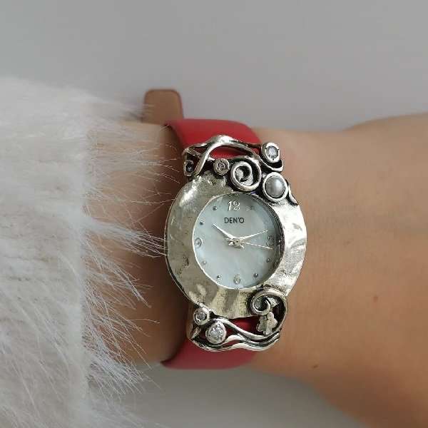 Часы из серебра 925 пробы, вставка жемчуг, куб.циркон. Диаметр вставок : куб.циркон - 3 мм и 2 мм, жемчуг - 4 мм. Размер корпуса часов 40 мм х 30 мм. Часы оснащены японским кварцевым механизмом с гарантией 1 год. Циферблат, диаметром 20 мм, покрыт натуральным перламутром. Сапфировое стекло. Ремешок: кожа, цвет - красный, ширина 16 мм. Средний вес изделия 25,3 гр. Производство Израиль.