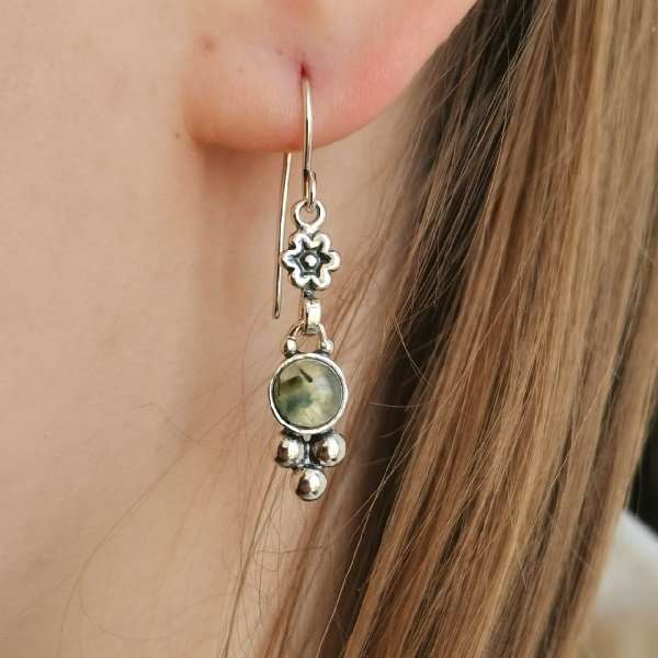 Серьги из серебра 925 пробы, вставка пренит. Диаметр вставки 6 мм. Длина серег 35 мм. Размер художественного элемента 25х7 мм. Средний вес изделия 3 гр. Производство Израиль.