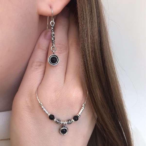 Колье из серебра 925 пробы, вставка гранённый оникс. Диаметр вставок 4 и 3 мм. Размер кулона 10 х7 мм. Средний вес изделия 4.3 гр. Производство Израиль.
