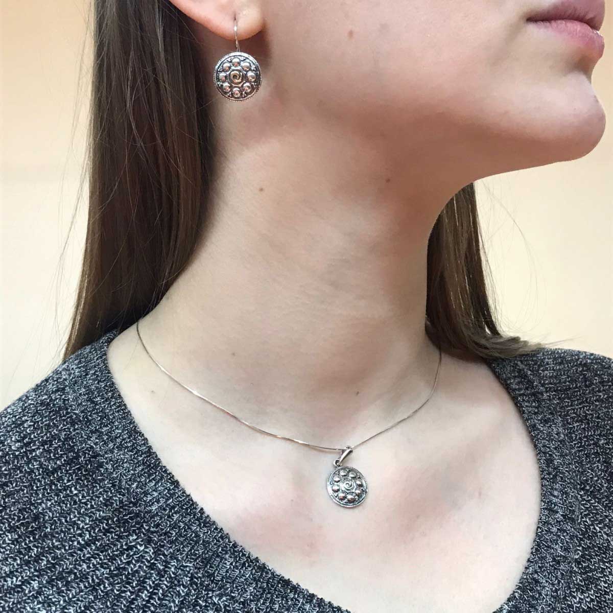 Колье из серебра 925 пробы, вставка пластина из золота. Диаметр декоративной части кулона 20 мм. Средний вес изделия 4,4 гр. Производство Израиль.
