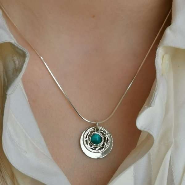 Колье из серебра 925 пробы, вставка бирюза диаметр 6 мм. Диаметр кулона 20 мм, цепь снейк 45 мм. Средний вес изделия 7,15 гр. Производство Израиль.