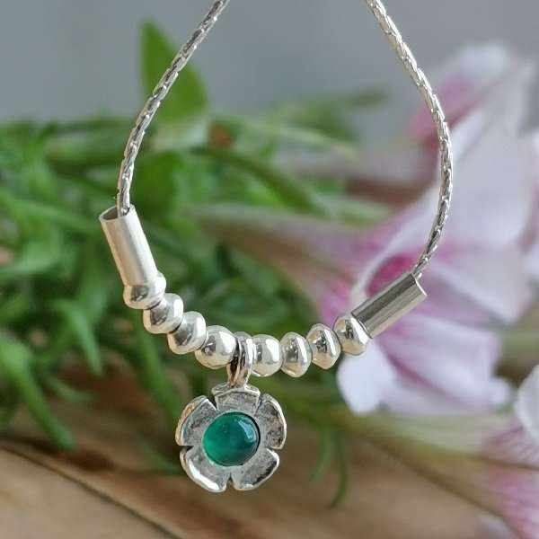 Колье из серебра 925 пробы, вставка изумрудный халцедон. Диаметр вставки 4 мм. Длина подвески 12 мм. Диаметр цветка 7мм. Средний вес изделия 4,5 гр. Плетение цепи снейк.Производство Израиль