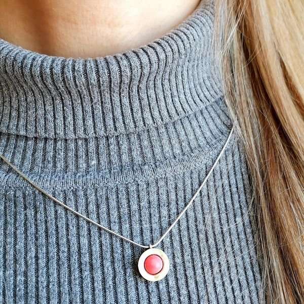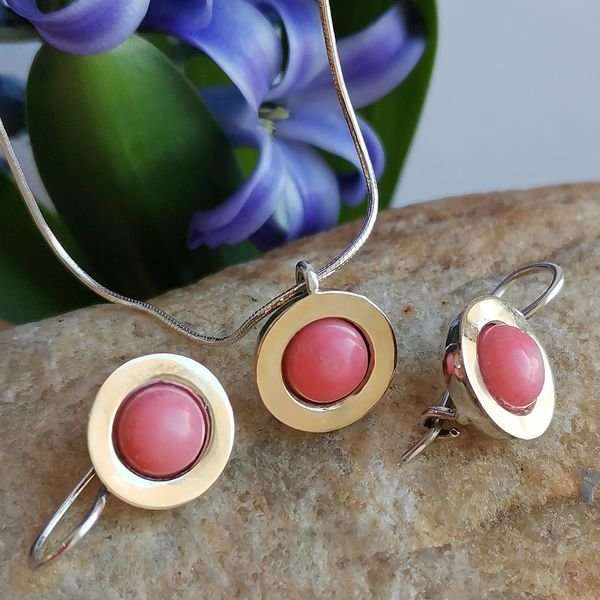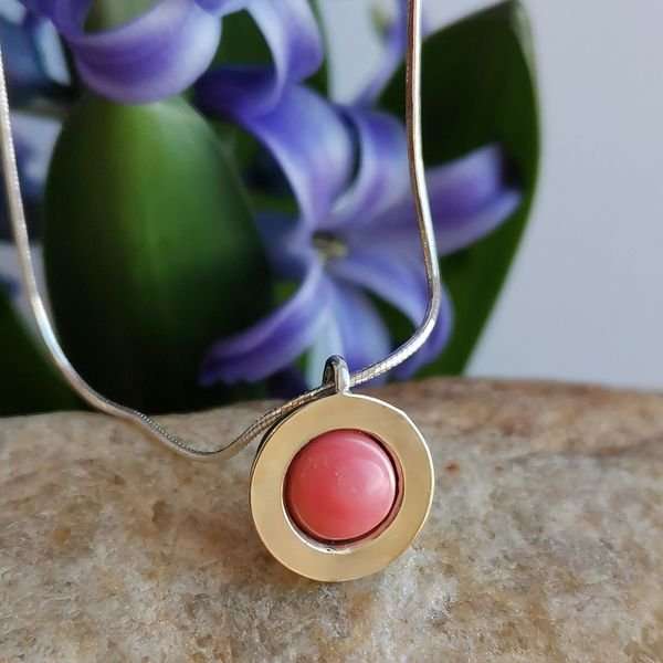 Колье из серебра 925 пробы, вставка коралл, золото. Диаметр вставки 7 мм. Диаметр кулона 11 мм, длина кулона с подвесом 14 мм. Средний вес изделия 5,4 гр. Производство Израиль.