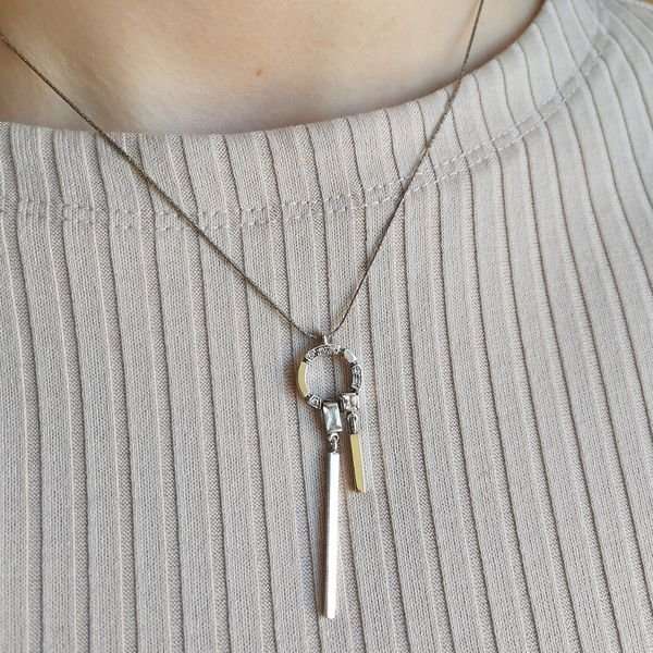 Колье из серебра 925 пробы, вставки пластина из золота, кубический циркон. Размер вставок 1,5, квадрат 2х2, прямоугольник 5х2 мм. Длина кулона 55 мм. Диамерт художественного элемента кулона 14 мм. Средний вес изделия 5,4 гр. Производство Израиль.