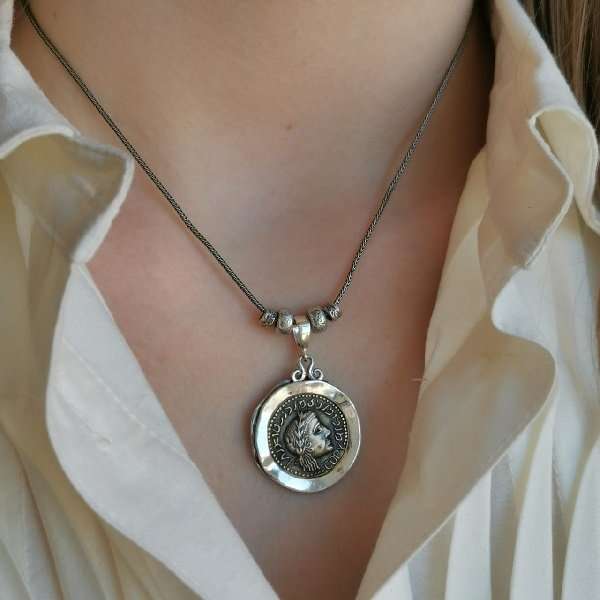 Колье из серебра 925 пробы, вставка - копия древнеримской монеты из латуни. Диаметр кулона 23 мм, длинна с подвесом 40 мм. Диаметр подвижных элементов 6мм, 5 мм. Средний вес изделия 12,5 гр. Производство Израиль.