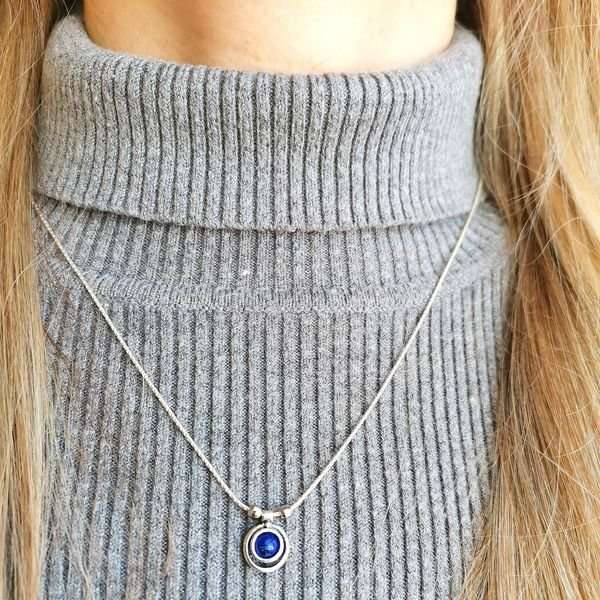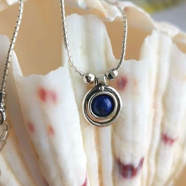 Колье из серебра 925 пробы, вставка лазурит. Диаметр вставки 5 мм. Длина подвески 12 мм, диаметр 10 мм. Средний вес изделия 4,4 гр. Производство Израиль.
