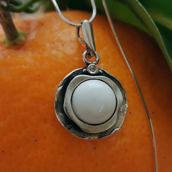 Колье из серебра 925 пробы, вставка белый жадеит, куб.циркон. Диаметр вставок: жадеит 10 мм, куб.циркон 1,5 мм. Диаметр художественной части 17мм. Длина кулона 25 мм, ширина 17 мм. Средний вес изделия 6.59 гр. Производство Израиль.