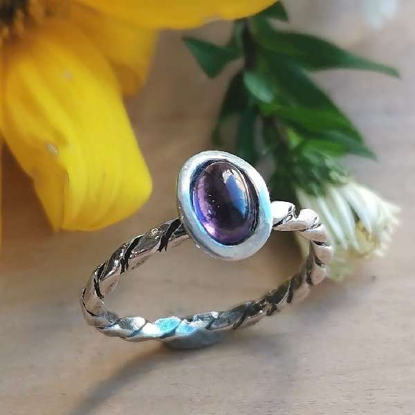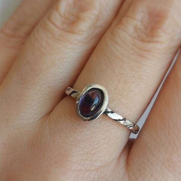 Кольцо из серебра 925 пробы, вставка аметист. Размер вставки овал 4х6 мм. Ширина верхней части кольца 8,5х 6,5 мм, ширина шинки кольца 2 мм. Средний вес изделия 1,8 гр. Производство Израиль.