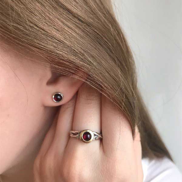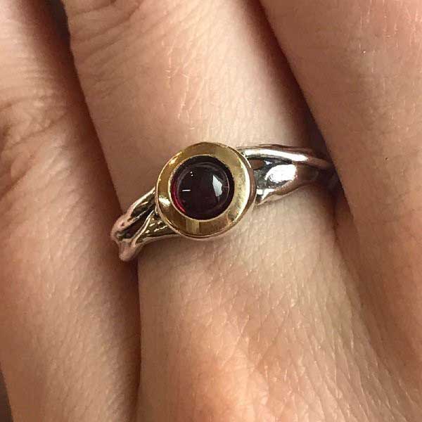 Кольцо из серебра 925 пробы, вставка пластина из золота, гранат. Диаметр вставки 5 мм. Ширина шинки изделия 2 мм. Диаметр верхней части кольца 8 мм. Средний вес изделия 3,3 гр. Производство Израиль.