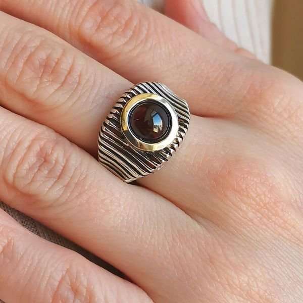 Кольцо из серебра 925 пробы, вставка золото, гранат. Размер вставки гранат 7 мм. Ширина верхнейчасти кольца 15 мм. Ширина шинки изделия 4 мм. Средний вес изделия 4,9 гр. Производство Израиль.