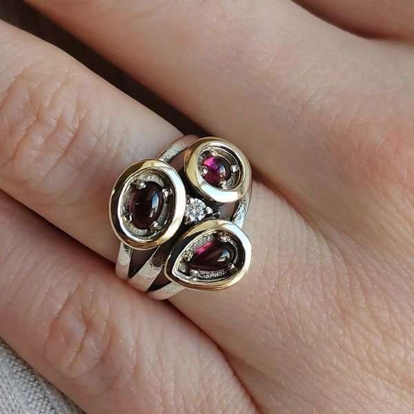 Кольцо из серебра 925 пробы, вставка гранат, куб.циркон, пластина из золото. Размер вставок гранат (овал) 4х3, (капля) 4х3, (круг) 3 мм, куб.циркон 2 мм. Размер верхнейчасти кольца 16х16 мм. Ширина шинки изделия 4 мм. Средний вес изделия 5,4 гр. Производство Израиль.