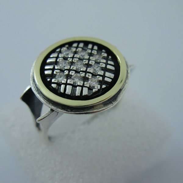 Кольцо из серебра 925 пробы, вставка пластина из золота, куб.циркон. Диаметр вставки куб.циркона 2 мм. Ширина верхней части кольца 18 х 23 мм. Ширина шинки 3 мм. Средний вес изделия 5,21 гр. Производство Израиль.