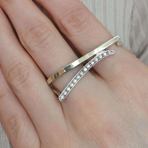 Кольцо из серебра 925 пробы, вставка золото, куб.циркон. Диаметр вставки 2 мм. Ширина шинки 2 мм. Длина верхней части кольца 40 мм. Средний вес изделия 6,2 гр. Производство Израиль.Кольца на два пальца, также известные как двойные кольца или кольца для двух пальцев, представляют собой уникальные украшения, которые охватывают два пальца одновременно. Данная модель - регулируемая (одно из колец), что позволяет подгонять ее под индивидуальные размеры. Кольца на два пальца могут стать отличным подарком для тех, кто ценит оригинальные и нестандартные украшения.