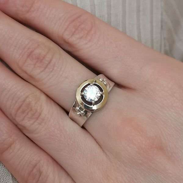 Кольцо из серебра 925 пробы, вставка пластина из золота, куб.циркон. Диаметр вставки 6 мм.Диаметр художественного элемента 11 мм. Ширина шинки 5 мм. Средний вес изделия 4,4 гр. Производство Израиль.