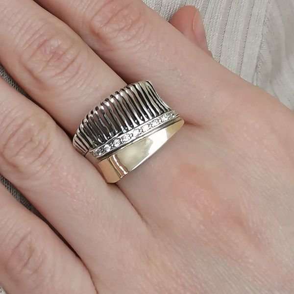 Кольцо из серебра 925 пробы, вставка пластина из золота, куб.циркон.Размер вставки 1,5 мм. Ширина верхней части кольца 16 мм. Ширина шинки 6 мм. Средний вес изделия 6,4 гр. Производство Израиль.