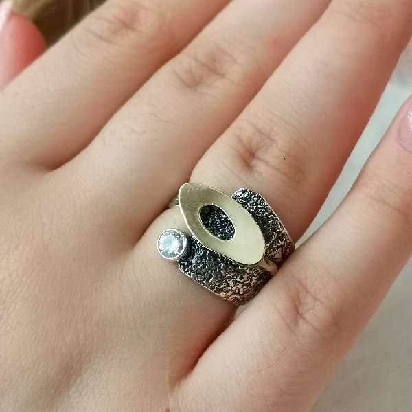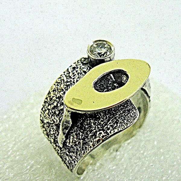 Кольцо из серебра 925 пробы, вставка пластина из золота, куб.циркон. Диаметр вставки куб.циркона 5 мм. Ширина верхней части кольца 18 мм. Ширина шинки 8 мм. Средний вес изделия 6.7 гр. Производство Израиль.
