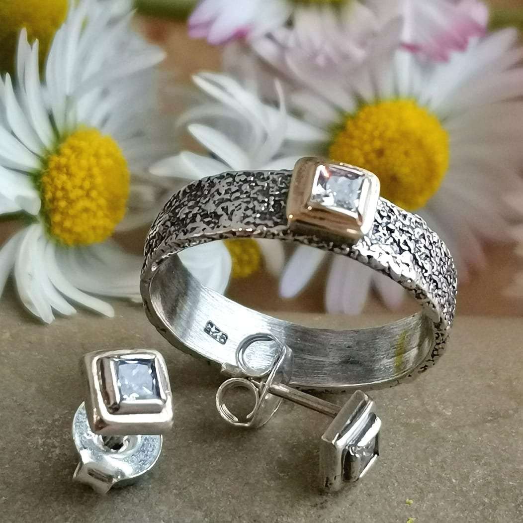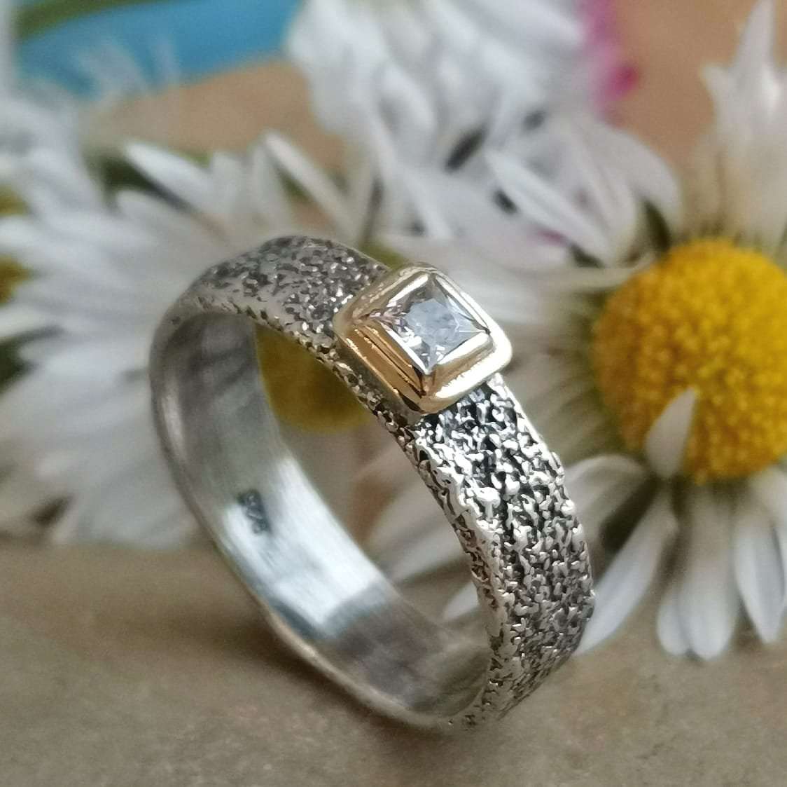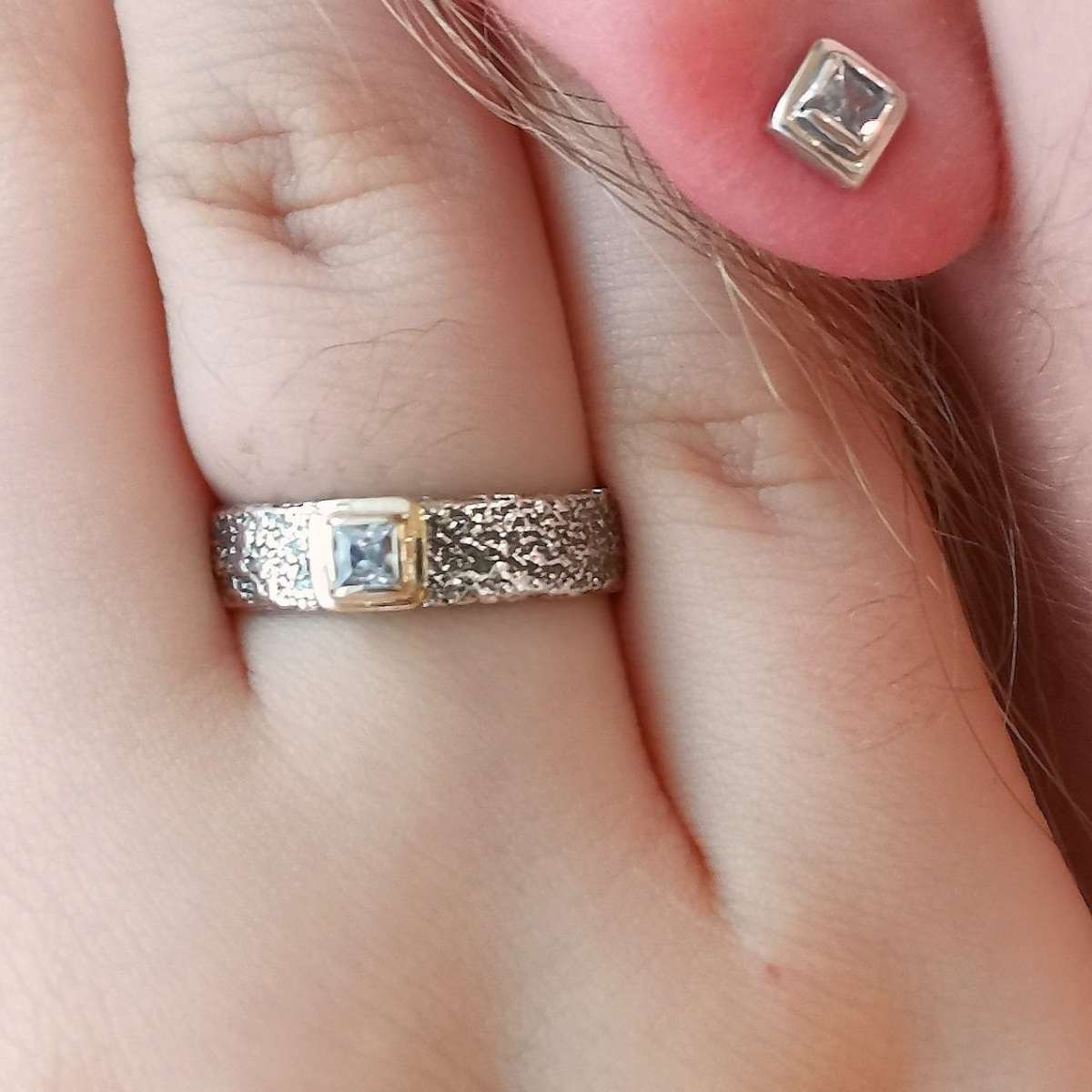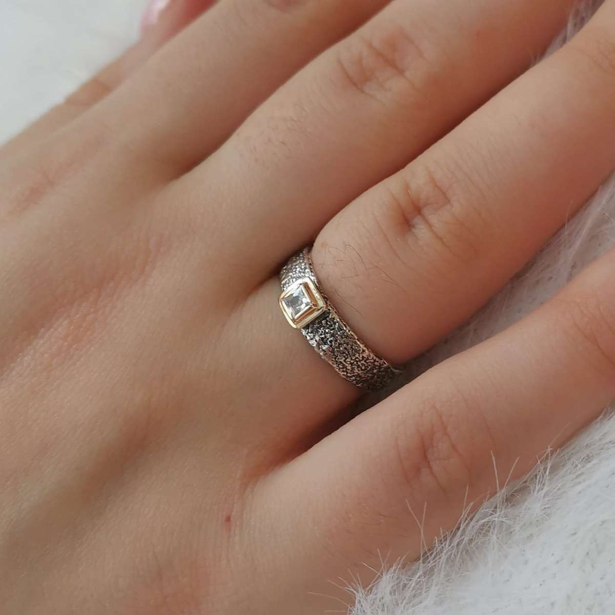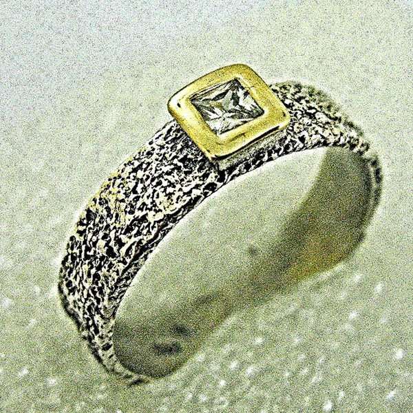 Кольцо из серебра 925 пробы, вставка пластина из золота, куб.циркон. Диаметр вставки куб.циркона 3х3 мм.Размер художественного элемента 5х5. Ширина шинки 5 мм. Средний вес изделия 3,3 гр. Производство Израиль.
