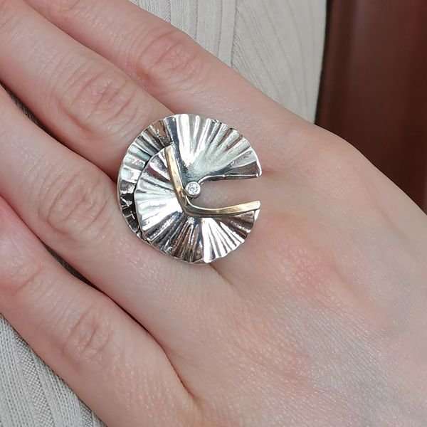 Кольцо из серебра 925 пробы, вставка золото, куб.циркон. Диаметр вставки 2 мм. Ширина шинки изделия 3 мм. Диаметр верхней части кольца 26 мм. Средний вес изделия 7,19 гр. Производство Израиль.
