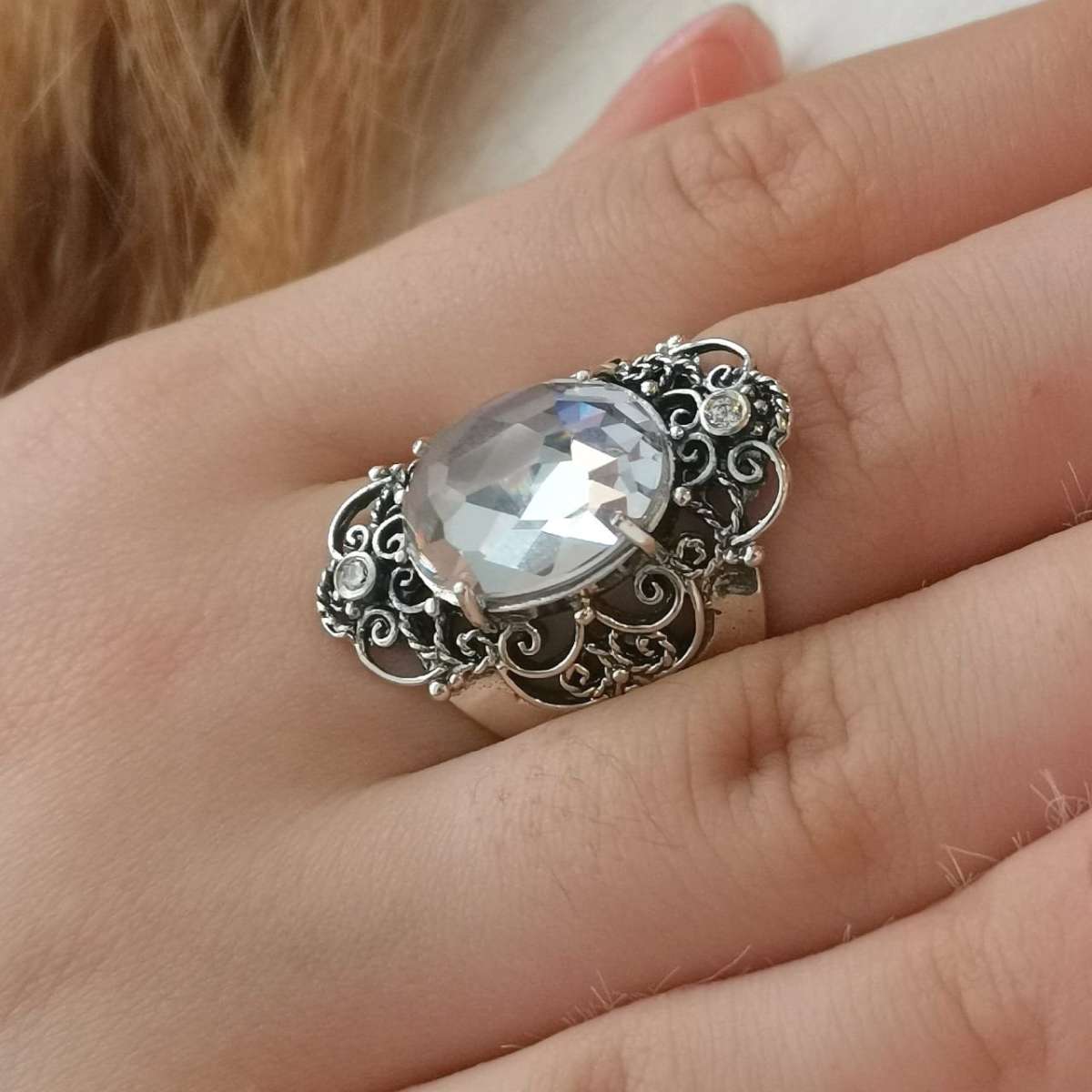 Кольцо из серебра 925 пробы, вставка куб.циркон. Размер овала 16 х 12 мм. Диаметр куб.циркона 2 мм. Ширина верхней части кольца 30 мм; ширина шинки - 6 мм. Средний вес изделия 10,4 гр. Производство Израиль.