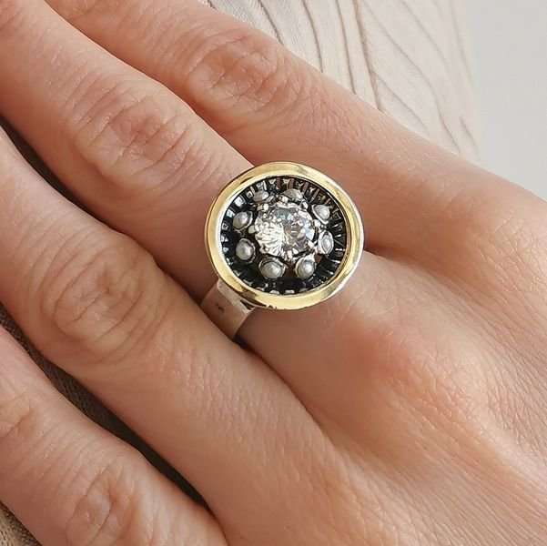 Кольцо из серебра 925 пробы, вставка золото, куб.циркон, жемчуг. Размер вставок жемчуг 3 мм, циркон 7 мм. Диаметр художественного элемента 18 мм.. Ширина шинки изделия 3 мм. Средний вес изделия 7 гр. Производство Израиль.