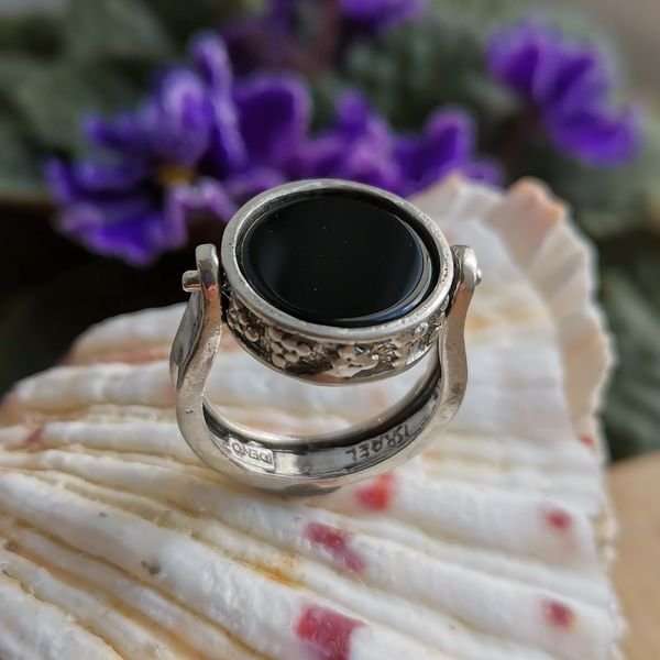 Кольцо из серебра 925 пробы, вставка лазурит, оникс. Верхняя часть вращается, что позволяет носить кольцо той (лузурит) или иной вставкой наружу (оникс). Диаметр вставки 14 мм. Диаметр верхней части кольца 16 мм, ширина шинки кольца 5 мм. Средний вес изделия 9,2 гр. Производство Израиль.