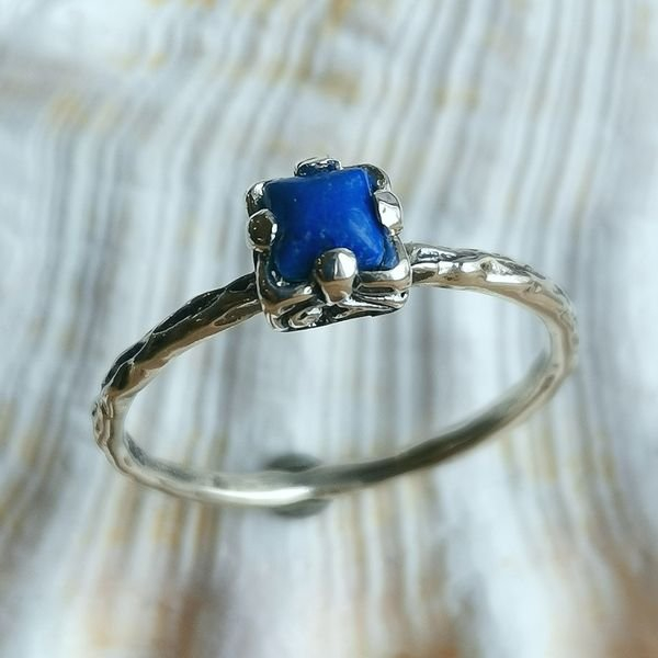 Кольцо из серебра 925 пробы, вставка лазурит. Размер вставки квадрат 4х4 мм. Ширина шинки кольца 2 мм. Размер художественного элемента 6х6 мм. Средний вес изделия 1,5 гр. Производство Израиль.