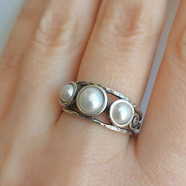 Кольцо из серебра 925 пробы, вставка жемчуг. Диаметр вставок 6 мм, 5 мм . Ширина верхней части кольца 8 мм, ширина шинки 4 мм. Средний вес изделия 4,7 гр. Производство Израиль.