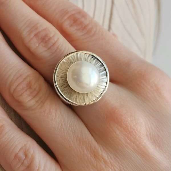 Кольцо из серебра 925 пробы, вставка жемчуг 12 мм. Диаметр верхнейчасти кольца 20 мм. Ширина шинки изделия 4 мм. Средний вес изделия 10,5 гр. Производство Израиль.
