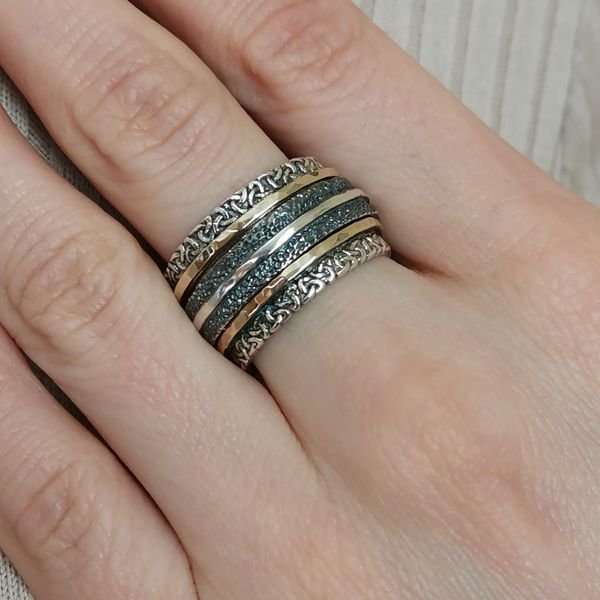 Кольцо из серебра 925 пробы, вставка пластина из золота. Ширина кольца 13 мм. Средний вес изделия 12 гр. Производство Израиль.