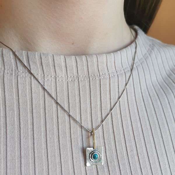 Кулон из серебра 925 пробы, золотая пластина, бирюза. Диаметр вставки 4 мм. Длина кулона 25 мм. Размер художественного элемента 12х12 мм. Средний вес изделия 1,5 гр. Цепь снейк 43 см в подарок. Производство Израиль.