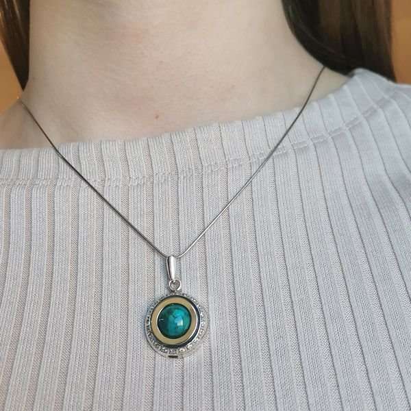 Кулон из серебра 925 пробы, золотая пластина, бирюза. Диаметр вставок бирюза 10, циркон 1,5 мм. Длина кулона с подвесом 30 мм. Диаметр художественного элемента 20 мм. Средний вес изделия 4,9 гр.Цепь снейк 43 см в подарок. Производство Израиль.
