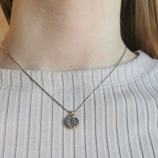 Кулон из серебра 925 пробы, золотая пластина, друза агата 8х6 мм. Длина кулона 15 мм. Размер художественного элемента 14х12 мм. Средний вес изделия 1,53 гр. Цепь снейк 43 см в подарок. Производство Израиль.