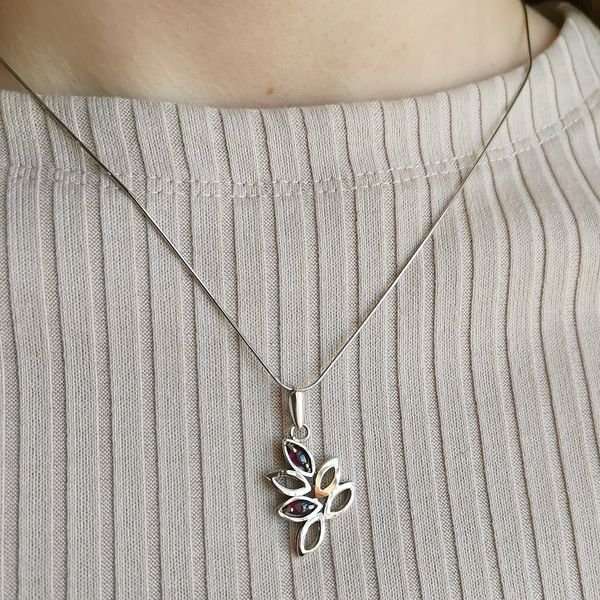 Кулон из серебра 925 пробы, золотая пластина, гранат 4х2 мм. Длина кулона с подвесом 35 мм. Размер художественного элемента 25х15 мм. Средний вес изделия 2,8 гр. Производство Израиль.