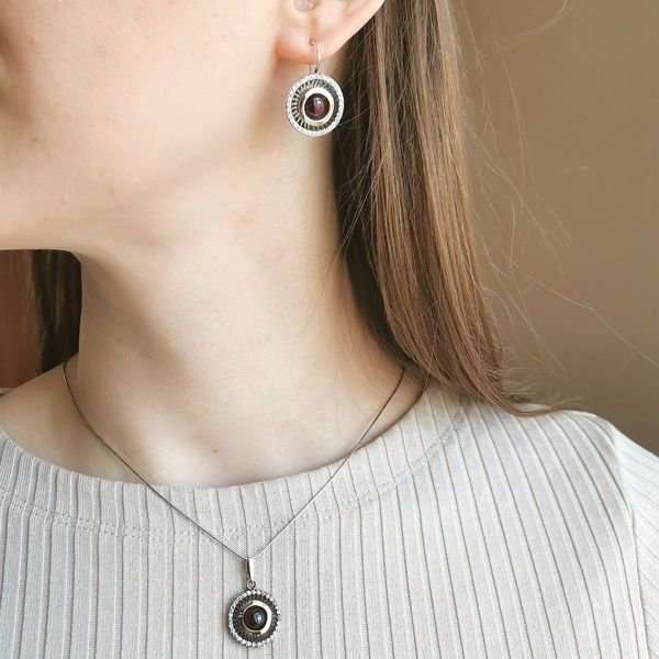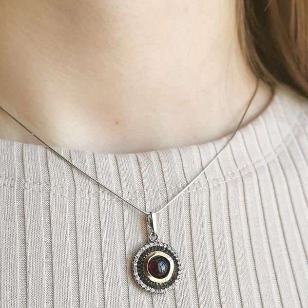 Кулон из серебра 925 пробы, золотая пластина, гранат, кубический циркон. Диаметр вставки циркон 1 мм. Диаметр вставки гранат 8 мм. Длина кулона с подвесом 30 мм. Диаметр художественного элемента 19 мм. Средний вес изделия 4,12 гр. Производство Израиль.