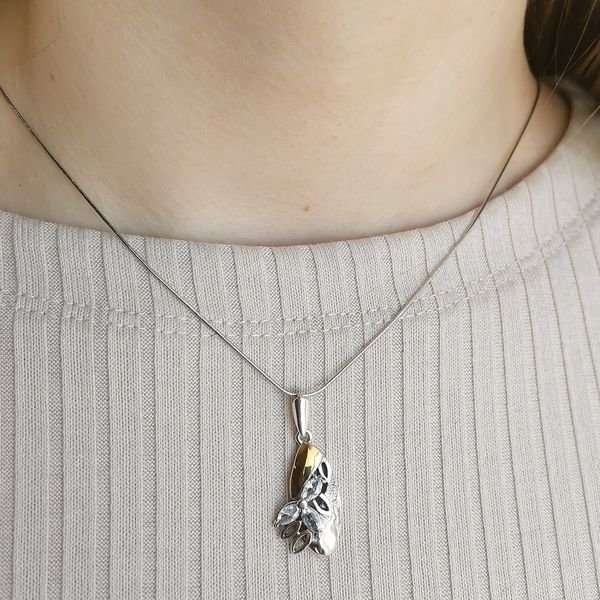 Кулон из серебра 925 пробы, золотая пластина, кубический циркон. Размер вставки (маркиз) 6х4 мм. Длина кулона с подвесом 34 мм. Размер художественного элемента 23х14 мм Средний вес изделия 2,7 гр. Производство Израиль.