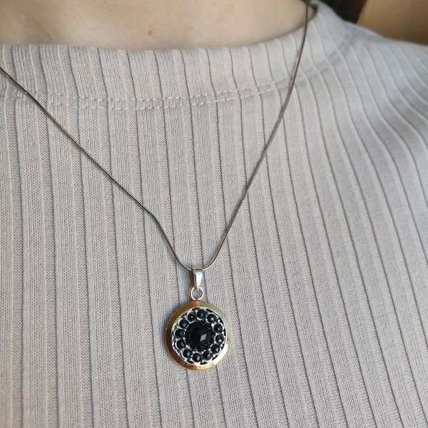 Кулон из серебра 925 пробы, вставки золотая пластина, граненый оникс. Диаметр вставок 7 и 2 мм. Длина кулона с подвесом 30 мм. Диаметр художественного элемента 20 мм. Средний вес изделия 3,7 гр. Цепь снейк 43 см в подарок. Производство Израиль.