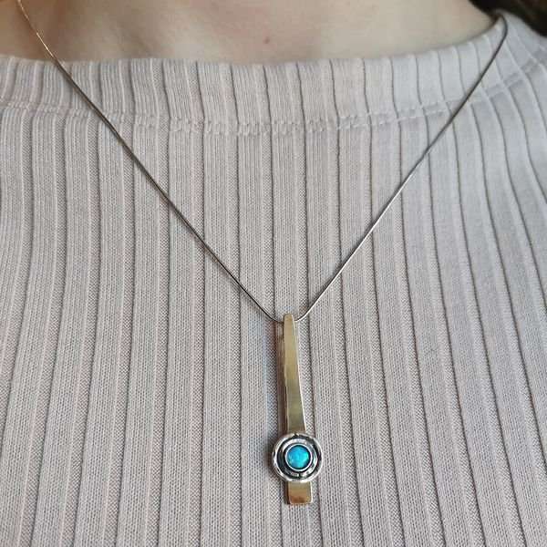Кулон из серебра 925 пробы, золотая пластина, искусственный опал. Диаметр вставки 5 мм. Длина 45 мм. Диаметр художественного элемента 12 мм. Средний вес изделия 3,19 гр. Цепь снейк 43 см в подарок. Производство Израиль.