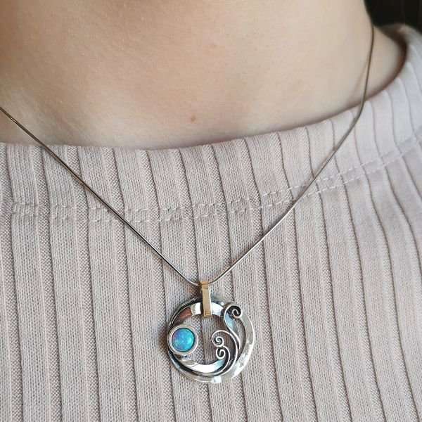 Кулон из серебра 925 пробы, вставки золотая пластина, искусственный опал. Диаметр вставки 5 мм. Длина кулона 25 мм. Диаметр художественного элемента 21 мм. Средний вес изделия 2,5 гр. Цепь снейк 43 см в подарок. Производство Израиль.