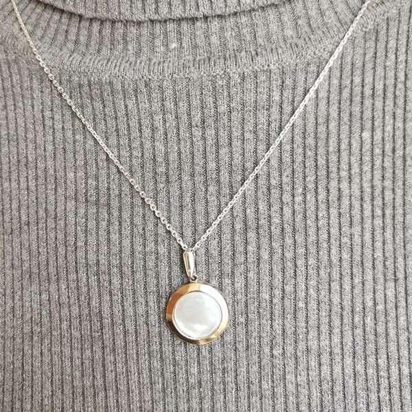 Кулон из серебра 925 пробы, вставка пластина из золота, перламутр. Диаметр вставки 14 мм. Длина кулона с подвесом 30 мм, диаметр 19 мм. Средний вес изделия 3,8 гр. Производство Израиль.Эффектный кулон, с круглой вставкой - обязательно сделает свою владелицу счастливой. Нагрудные украшения с круглыми медальонами из благородных металлов издавна считались особенными, когда-то их носили лишь избранные, как знак почёта. В наш век демократии, такие кулоны может носить любая модница, если ей того захочется. Цепь якорного плетения 60 см в подарок.