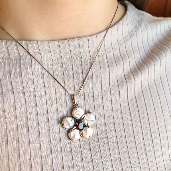 Кулон из серебра 925 пробы, вставки золотая пластина, барочный жемчуг, гранат. Диаметр вставки из жемчуга 10 мм. Размер вставки из граната 6х8 мм. Длина кулона с подвесом 40 мм. Диаметр художественного элемента 30 мм. Средний вес изделия 7,8 гр. Цепь снейк 43 см в подарок. Производство Израиль.