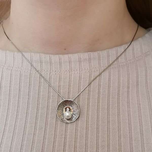 Кулон из серебра 925 пробы, вставки золотая пластина, жемчуг, кубический циркон. Диаметр вставок жемчуг 5,5 мм, куб циркон 2 мм Диаметр художественного элемента 19 мм. Средний вес изделия 5,6 гр. Производство Израиль.