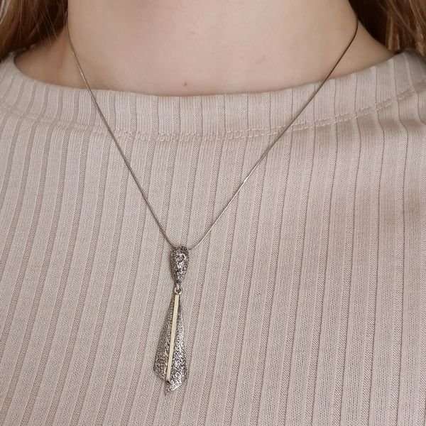 Кулон из серебра 925 пробы, вставка золотая пластина. Ширина узкой части 4 мм, широкой 12 мм. Длина кулона с подвесом 55 мм Средний вес изделия 3,5 гр. Производство Израиль.