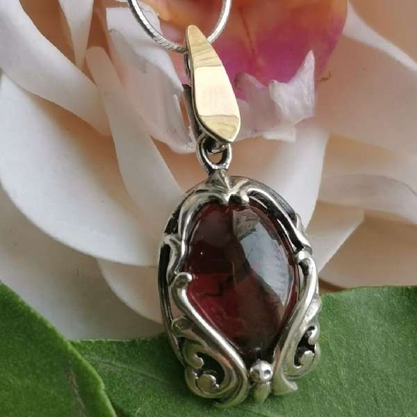 Колье из серебра 925 пробы, вставка гранат, пластина из золота. Размер вставки овал 10х13 мм. Размер кулона 20х15 мм. Длина кулона с подвесом 30 мм. Длина цепочки 45 см и 50 см. Средний вес изделия 5,43 гр. Производство Израиль.Стильное колье с авантажной подвеской. Гранат, вставленный в благородный металл, смотрится весьма эксцентрично, как лёд и пламя. Изящная цепочка в виде колоска придаёт украшению рафинированности. Очаровательный тиснёный орнамент на оправе выполнен в Израильском стиле и притягивает взгляды. Такому подарку будет рада даже самая требовательная ценительница серебряных украшений. В комплекте предлагаются изумительные серьги.