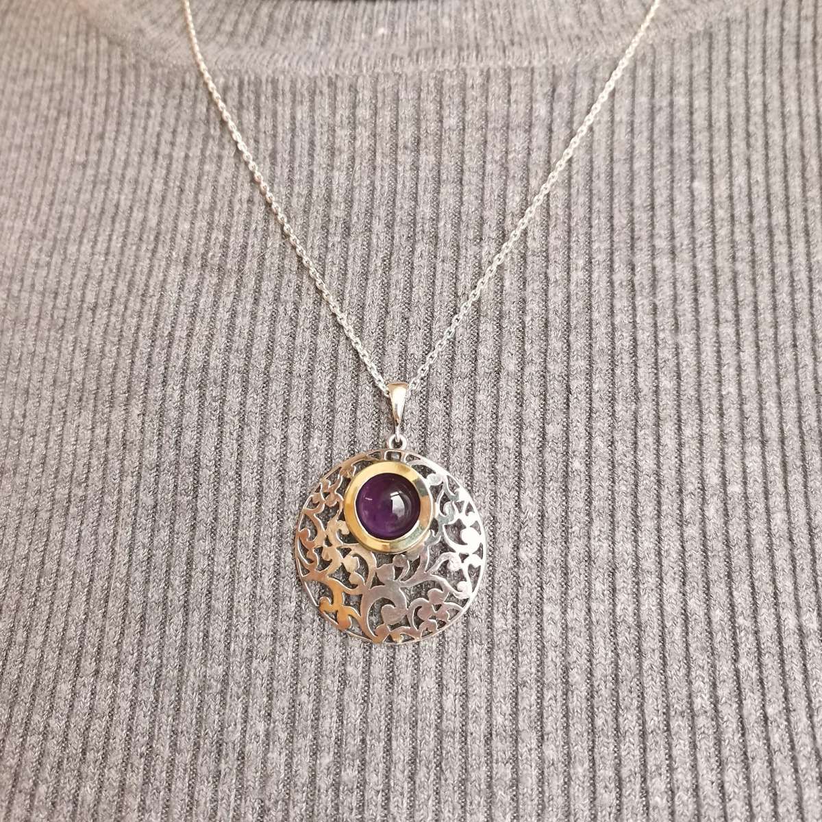 Колье из серебра 925 пробы, вставка аметист, пластина из золота. Плетение цепи якорное. Диаметр камня 10мм. Длина подвески 40мм. Диаметр художественной части 30 мм. Средний вес изделия 10 гр. Производство Израиль.