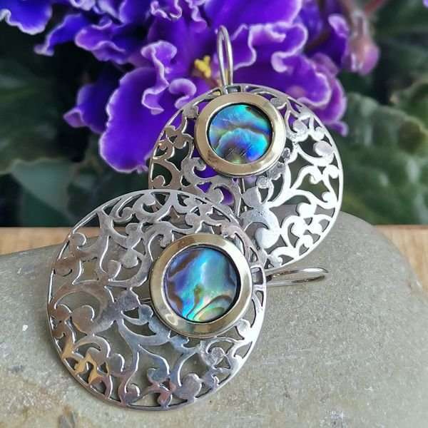 Серьги из серебра 925 пробы, вставка перламутр (галиотис), пластина из золота. Диаметр вставки 10,0 мм. Диаметр художественной части 30 мм. Длина серег 4 см. Средний вес изделия 11,85 гр. Производство Израиль.