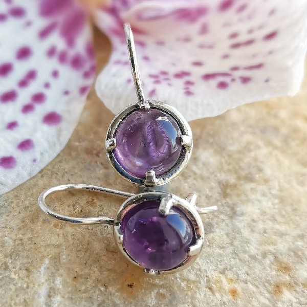 Серьги из серебра 925 пробы, вставка аметист. Диаметр вставки 8 мм. Длина серег с дужкой 20 мм. Средний вес изделия 4.3 гр. Производство Израиль.