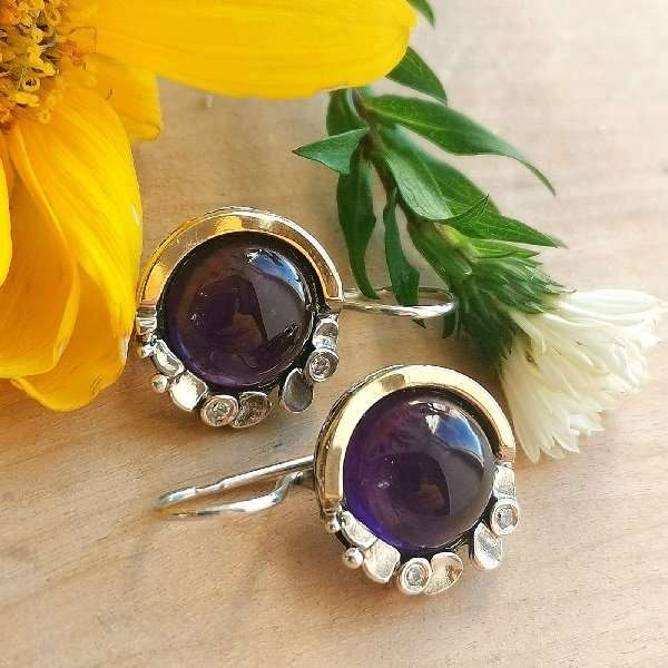 Серьги из серебра 925 пробы, вставка аметист, куб.циркон, пластина из золота. Диаметр вставок: аметист 10 мм, куб.циркон 1,5 мм. Длина серег с дужкой 25 мм. Диаметр художественного элемента 14 мм. Средний вес изделия 5,8 гр. Производство Израиль.